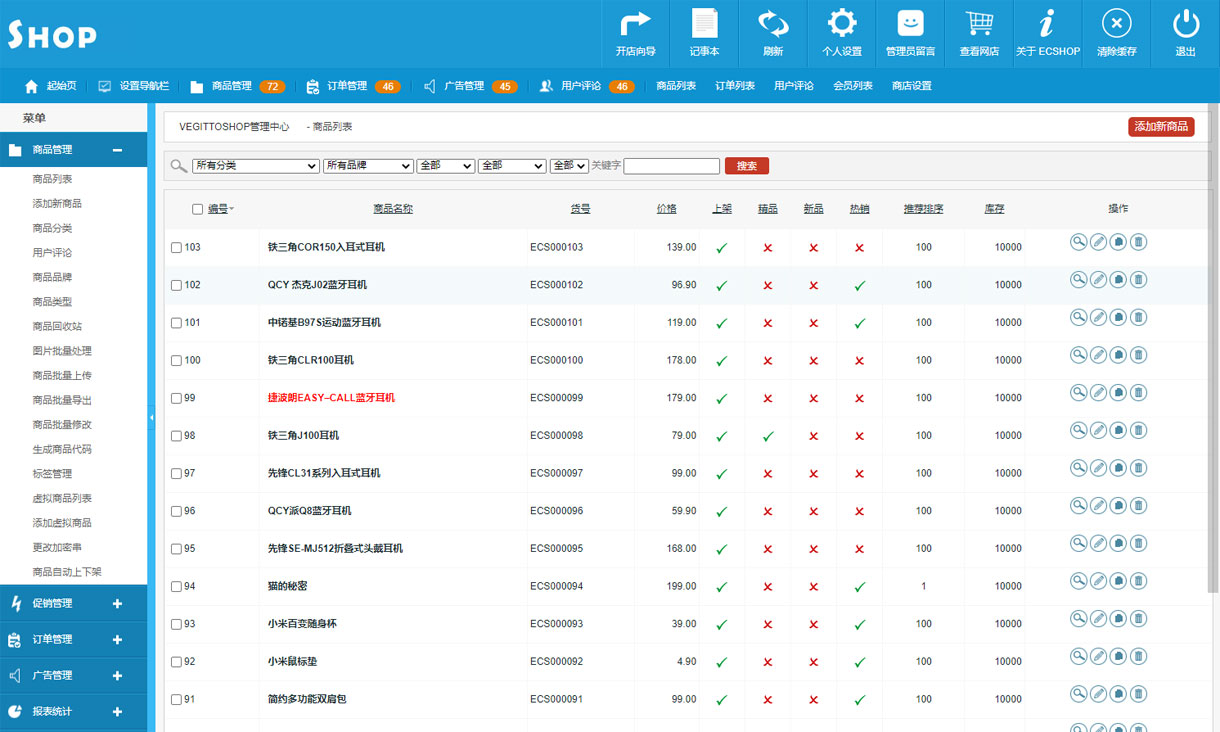 商品和分类管理、会员及订单管理、店铺管理、支付和其他接口管理